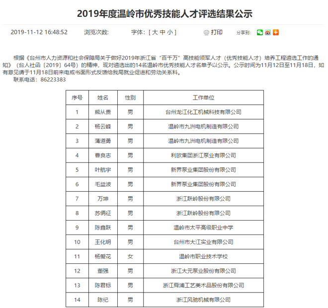 為高水平建設人才強省,進一步加快高技能人才隊伍建設,我司根據《臺州市人力資源和社會保障局關于做好2019年浙江省“百千萬”高技能領軍人才培養工程遴選工作的通知》要求,通過我司推薦,經資格初審、評委會評審等環節,我司研發中心陳紀被評選為溫嶺市優秀技能人才,并在網上予以公示,符合公司的價值觀 “客戶為先、誠信負責、團隊合作、務實創新”精神。