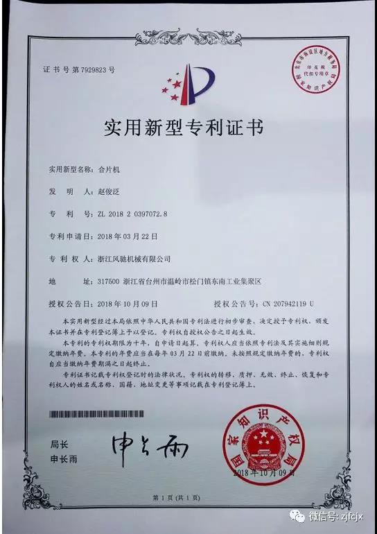 2018年10月榮獲“合片機(jī)”實(shí)用新型專利證書