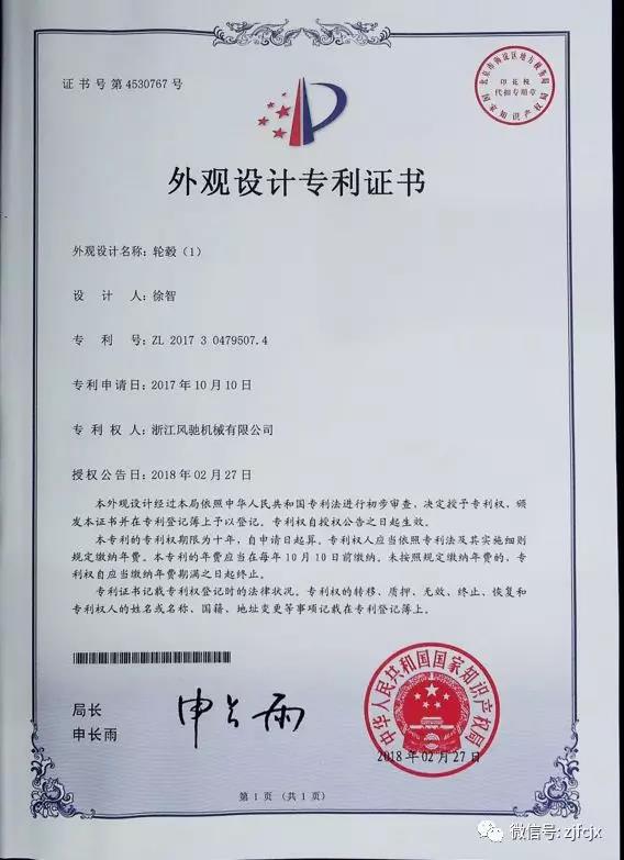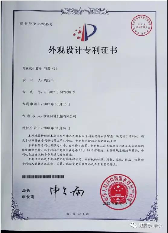 2018年3月榮獲“輪轂”外觀設(shè)計(jì)專利證書