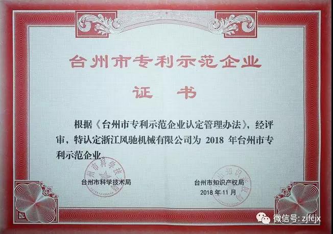 2018年11月榮獲臺(tái)州市知識(shí)產(chǎn)權(quán)局頒發(fā)的“臺(tái)州市專利示范企業(yè)”