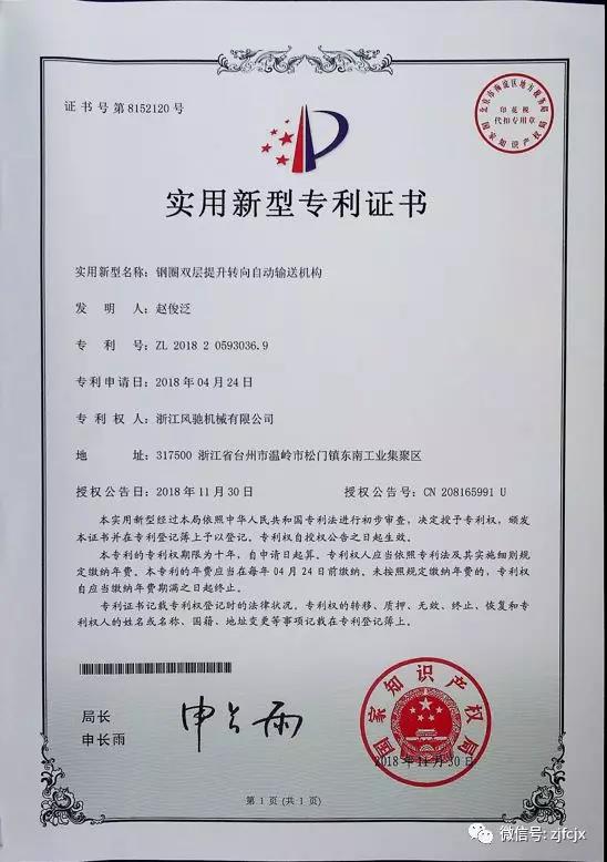 2018年11月榮獲“鋼圈雙層提升轉(zhuǎn)向自動(dòng)輸送機(jī)構(gòu)”實(shí)用新型專利證書